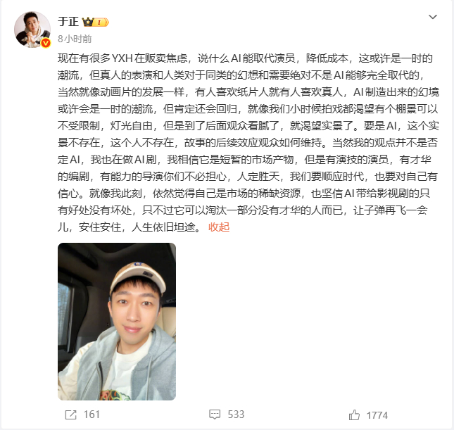 于正在微博中表示,现在有很多营销号在贩卖焦虑,声称AI能取代演员、降低成本。“这或许是一时的潮流,但真人的表演和人类对于同类的幻想和需要,绝对不是AI能够完全取代的。”