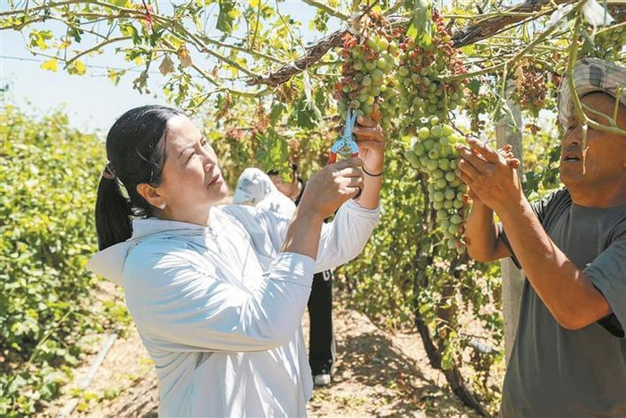 石梅花(左)帮助种植户修剪葡萄树(摄于2025年7月11日)。本人提供