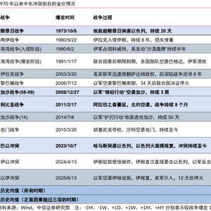 复盘1970年以来中东12次大型冲突前后的金价情况,我们发现战争爆发后短期(日/周/月度)金价涨幅有限,但中期(半年度)涨幅平均达到10%;金价的五大影响因素(包括是否涉及原油、战前预期、战争速度、美元信用和流动性)至少有三项为正面影响的时期,金价半年度平均涨幅则达到34%。本次中东冲突过程中,尽管前三项战争相关因素根据局势走向存在一定不确定性,但美元信用和流动性方面的趋势性利好因素并未扭转,我们参考历史情况继续看好后续金价上涨。