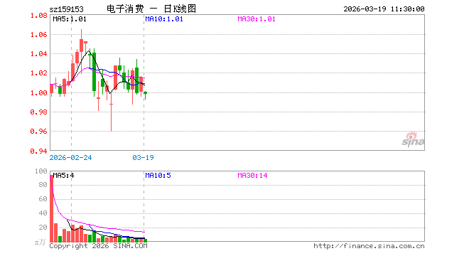 3月19日,截止午间收盘,消费电子ETF鹏华(159153)跌1.67%,报0.998元,成交额360.35万元。消费电子ETF鹏华(159153)重仓股方面,立讯精密截止午盘跌2.15%,兆易创新跌1.33%,胜宏科技跌3.17%,京东方A跌1.90%,东山精密涨5.38%,豪威集团跌1.99%,TCL科技跌1.53%,蓝思科技跌1.99%,长电科技跌1.92%,歌尔股份跌2.29%。