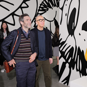 THE MONSTERS艺术家龙家升(右)与《帕丁顿熊》系列电影导演保罗·金(左)在THE MONSTERS十周年全球巡展巴黎站交流