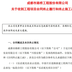 公告显示,成都路桥收到川投宏格发来的函件,被单方面终止了两个重大工程项目的部分或全部合同。