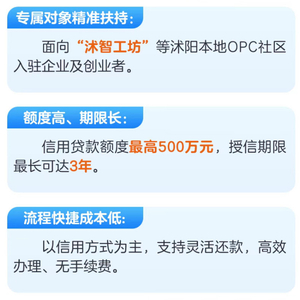 沭阳农商行推出的“OPC创易贷”产品,以信用方式为主,精准扶持沭阳本地OPC社区入驻企业及创业者,信用贷款额度最高500万元,授信期限最长可达3年。