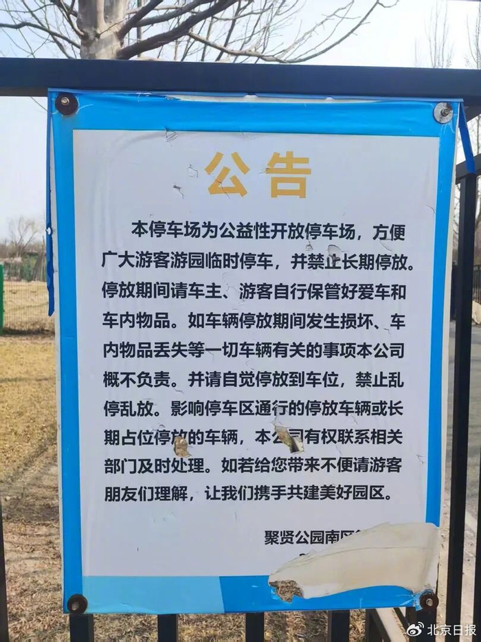 公园东侧的停车场入口处,张贴着一张公告,阐述该停车场公益性开放的用途,强调禁止长期停放,并且声明:“影响停车区通行的车辆或长期占位停放的车辆,本公司有权联系相关部门及时处理。”公告的落款并不完整,有破损痕迹。