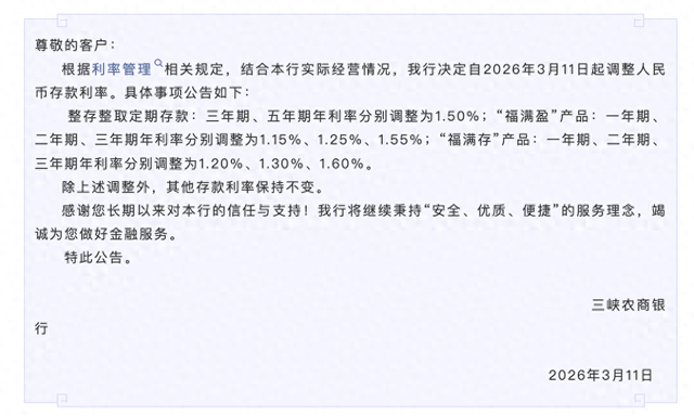 以湖北三峡农商银行为例,该行于3月11日调整人民币存款利率,其中整存整取3年期和5年期均降至1.50%,较此前下调5个基点;“福满盈”系列1年期、2年期、3年期产品分别下调至1.15%、1.25%和1.55%,降幅达25至30个基点。