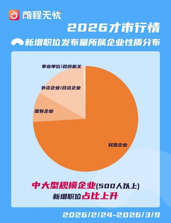 从企业性质来看,在主要企业类型中,民营企业的新增职位占比达74.1%,持续发挥稳就业的基本盘效能。外资企业、国有企业分别占节后新增职位的16.3%和9.1%,相较于往年呈现出明显增长。