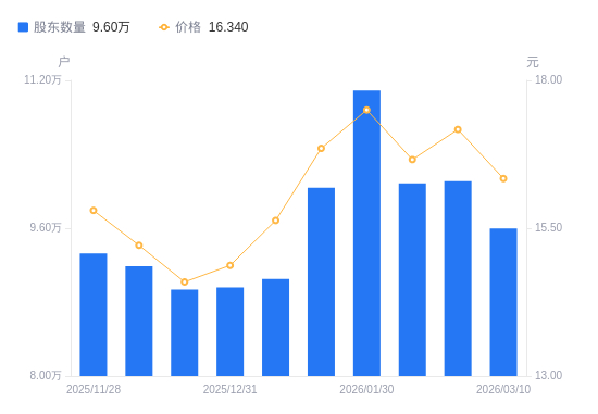 3月18日消息,数据显示,截至2026年3月10日,大港股份A股股东总户数为9.6万户,较上期(2026年2月27日)减少5122户,降幅5.07%。公司最新A股总股本为5.8亿股,其中流通A股5.8亿股,户均持有流通A股数量为6046.93股,较上期增加306.37股,增幅5.34%;户均持流通A股市值9.88万元,较上期增加241.35元,增幅0.24%。