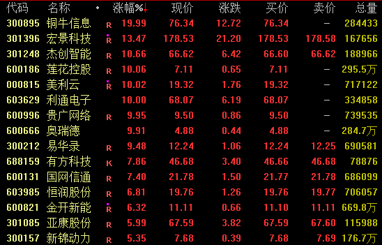 算力概念盘中再度活跃,截至收盘,铜牛信息涨20%创历史新高,宏景科技涨超13%,盘中涨超18%再创新高,杰创智能涨超10%,美利云、利通电子等均涨停。