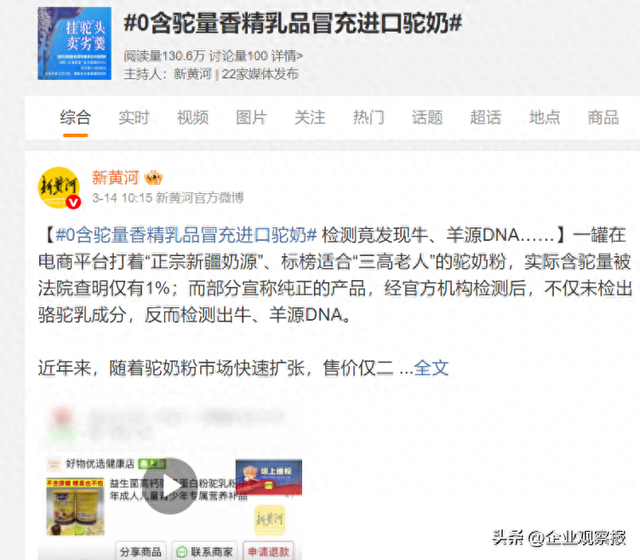 3·15国际消费者权益日前夕,齐鲁晚报、新黄河、北京商报等多家权威媒体在微博平台集中曝光了驼奶粉配料问题。市面上一款打着正宗新疆奶源、标榜适合三高老人的驼奶粉,实际含驼量仅1%;还有部分标注纯驼乳的产品根本检不出骆驼乳成分,反而检出牛、羊源DNA。#0含驼量香精乳品冒充进口驼奶# 这一相关话题阅读量飙升超过130万。
