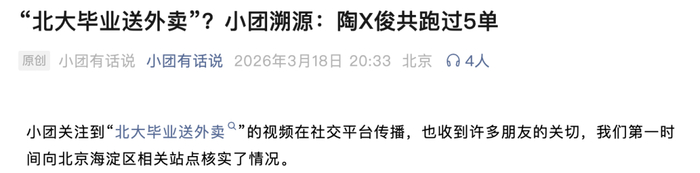 3月18日,美团官方账号“小团有话说”发文称,关注到“北大毕业送外卖”的视频在社交平台传播,也收到许多朋友的关切,美团第一时间向北京海淀区相关站点核实了情况。美团提到,美团骑手注册流程便捷,不强制要求提交学历学位证书,因此站点和平台并不掌握骑手的学历信息,也无法对个人声称的学历背景进行核实。