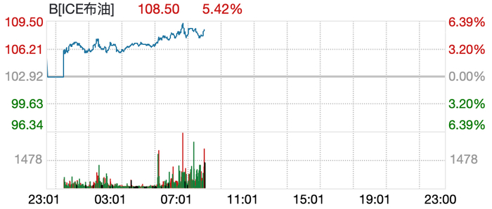 与此同时,国际油价大涨,ICE布油涨超5%,站上108美元/桶,WTI原油涨超1%,报96.53美元/桶。
