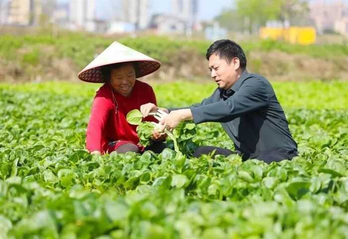 村民们在种植区采收新鲜蔬菜