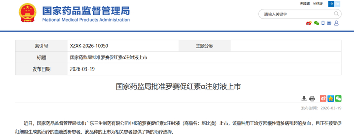 3月19日,国家药监局(NMPA)官网显示,三生制药的罗赛促红素α注射液(商品名:新比澳)获批上市,用于治疗因慢性肾脏病引起的贫血,且正在接受促红细胞生成素治疗的血液透析患者。这是首个获批上市的国产重组促红细胞生成素(EPO)创新药。