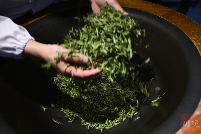在鹤鸣茶社中央,制茶师现场炒制春茶吸引茶客驻足