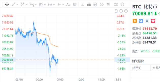 比特币一度盘中跌破7万美元关口,过去24小时内跌5.4%。行情显示,比特币跌至70109.9美元,过去24小时内跌5.44%;行情显示,以太坊跌至2166.42美元,过去24小时内跌6.94%。