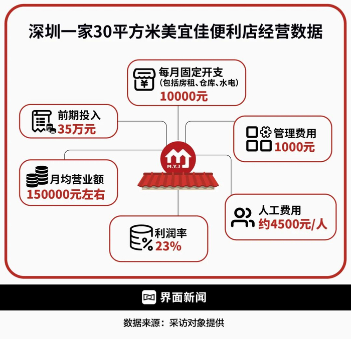 吴泽林向界面新闻算了一笔账:他经营着一家约30平方米的门店,日均营业额约5000元,毛利率约23%。但固定开支每月超过1万元,其中员工薪酬约4500元,美宜佳还需收取1000元管理费。