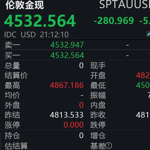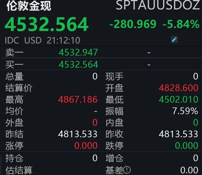 截至记者发稿,伦敦金现报4532.564美元/盎司,日内大跌5.84%,盘中最低触及4502.01美元/盎司,距离跌破4500美元/盎司仅一步之遥。