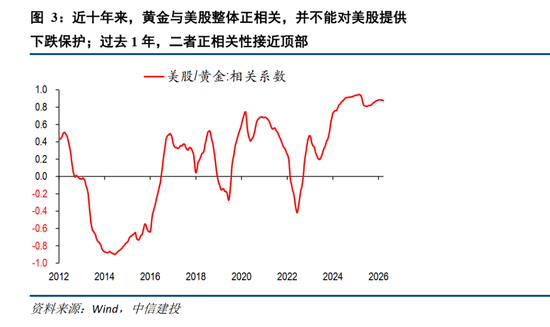 金价和标普500的历史相关性显示,其在2013-2015年前后曾长期维持负相关,但近十年来,负相关性已经基本消失,逐渐转为正相关居多,尤其是2025年,二者正相关性甚至达到1附近。这意味着,在美股出现重大风险时,黄金并不能起到对冲作用。美伊冲突爆发后,美股和全球股市承压明显,这可能也是金价无法被催化的原因之一。