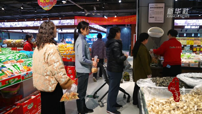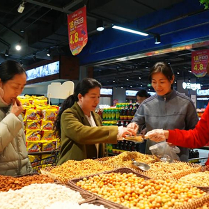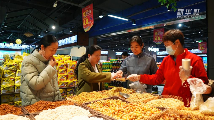 在城区一家大型商超,炒豆专区格外醒目。黄豆、黑豆、花生、面豆品类齐全,原味、五香、奶香等口味丰富,豆香四溢,节日氛围浓厚。市民络绎不绝,前来品尝挑选,将寄托着平安健康、风调雨顺等美好愿望的“节日标配”装进购物车。