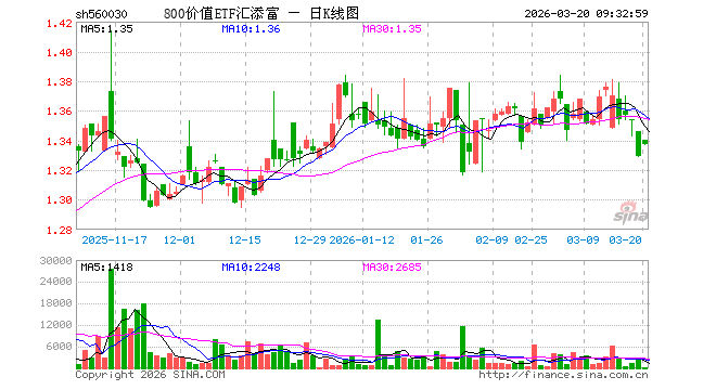 3月20日,800价值ETF汇添富(560030)开盘涨0.83%,报1.340元。800价值ETF汇添富(560030)重仓股方面,中国平安开盘涨0.30%,招商银行涨0.20%,美的集团跌0.11%,兴业银行涨0.11%,中信证券涨0.04%,工商银行涨0.00%,国泰海通跌0.06%,农业银行跌0.44%,交通银行涨0.00%,伊利股份涨0.04%。