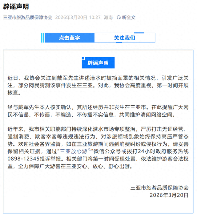 戴军称潜水时被摘面罩,三亚市旅游品质保障协会:不是在三亚