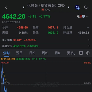 3月20日亚洲早盘,黄金白银高开后直线跳水。截至今早7:24,现货黄金报价4642.42美元/盎司。