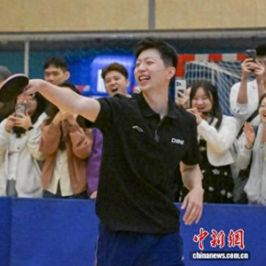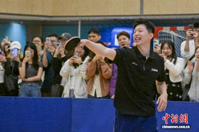 图为马龙与学生进行乒乓球互动交流。中新网记者 陈永诺 摄