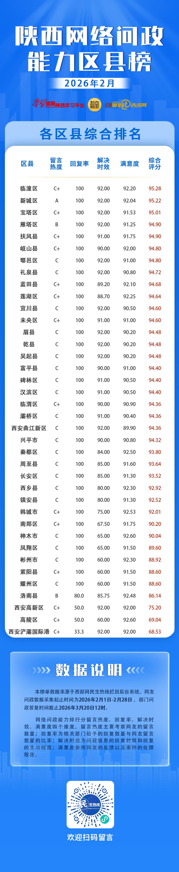 2026年2月,西部网民生热线与陕西38个区县(开发区)进行了网络问政沟通对接。根据各区县(开发区)留言热度、回复情况和网友满意度的综合评定,西安临潼区、西安新城区、延安宝塔区分别以总分95.28、95.22、95.01位列网络问政能力2月区县榜前三名。