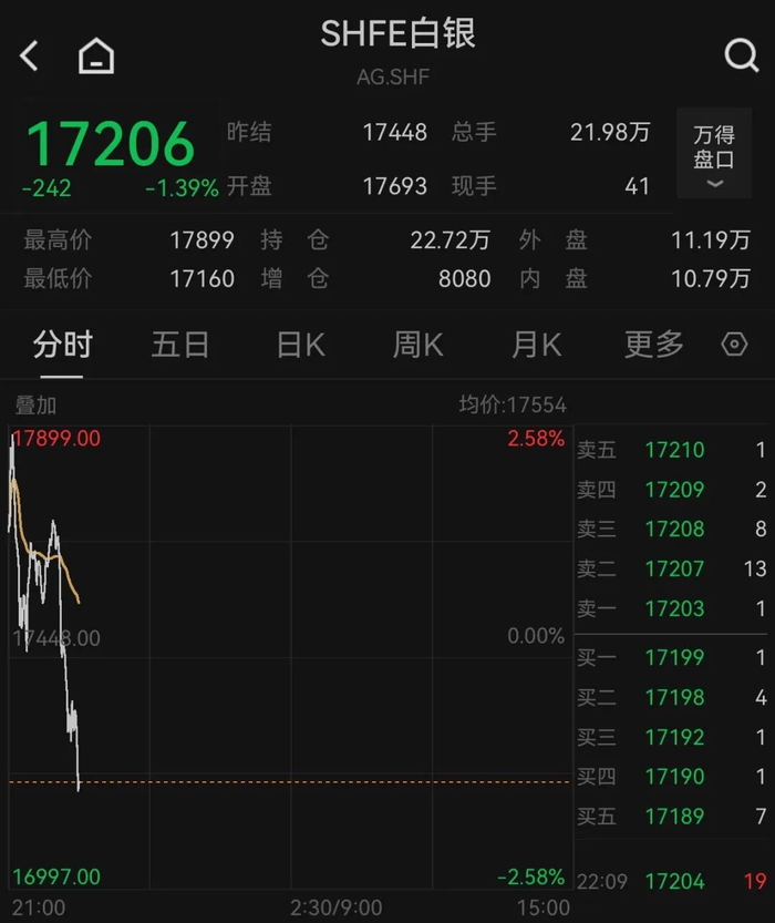 沪银主力合约日内由涨转跌,现跌超1%,报17206元/千克,此前一度涨超2%。