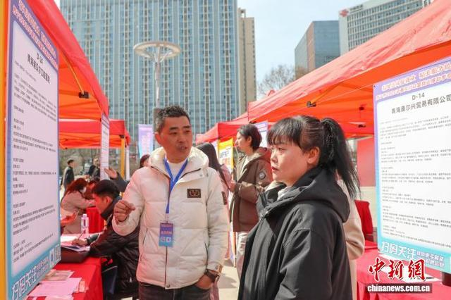 3月20日,青海省西宁市举办2026年春风行动暨就业援助季专场招聘会。124家企业提供物流运输、医药卫生、绿色能源等24个行业的岗位,吸引就业者前来应聘。图为求职者(右)了解用工信息。中新社记者 马铭言 摄