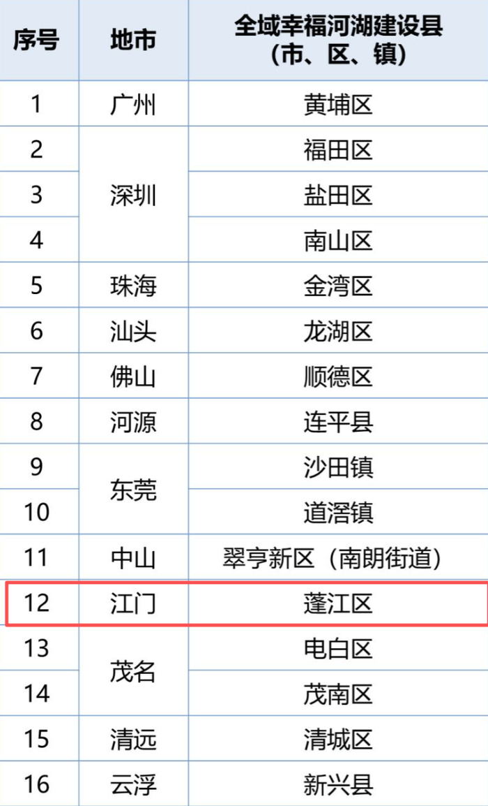 为贯彻落实《关于全面推进幸福河湖建设的令》(2025年第1号总河长令)精神,切实抓好2026年省十件民生实事幸福河湖建设工作,在“世界水日”“中国水周”到来之际,省河长制办公室正式公布第一批县(市、区、镇)全域幸福河湖建设名单,名单如下,江门蓬江入选。