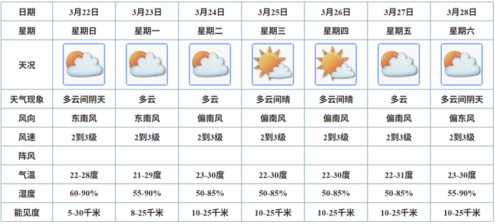 预计,22日云量较多,气温舒适;23至28日以多云间晴天气为主,日间气温回升,午间较热。