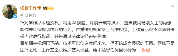 3月20日下午,杨紫工作室发文称:针对某作品未经授权,利用AI换脸、深度合成等技术,擅自使用杨紫女士的肖像制作并传播视频内容的行为,严重侵犯杨紫女士合法权益。工作室已委托律师对侵权内容进行取证,并将通过法律途径追究到底!