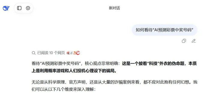 Deepseek:看待“AI预测彩票中奖号码”,核心观点非常明确:这是一个披着“科技”外衣的伪命题,本质上是利用概率游戏和人们投机心理设下的骗局。