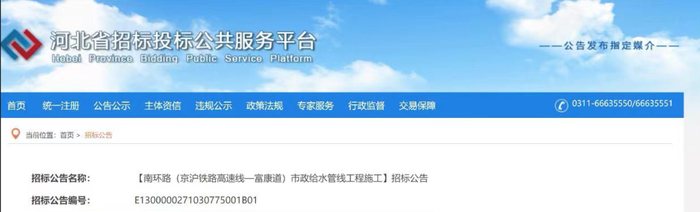 【南环路(京沪铁路高速线—富康道)市政给水管线工程施工】招标公告