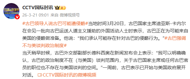 据CCTV国际时讯,当地时间3月20日,古巴国家主席迪亚斯-卡内尔在会见一批向古巴运送人道主义援助的外国活动人士时表示,古巴正在为可能来自美国的侵略做准备。他说:“我们承认可能存在针对古巴的侵略行为。”
