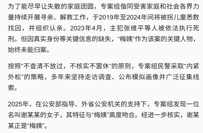 3月21日,记者从广州市公安局了解到,经警方不懈努力,“张维平等人拐卖儿童案”取得重大进展,犯罪嫌疑人谢某某(女)落网,其即为该案关键人物“梅姨”。