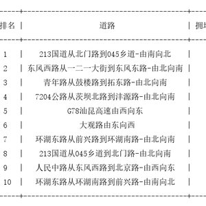 昆明道路拥堵排行榜top10: