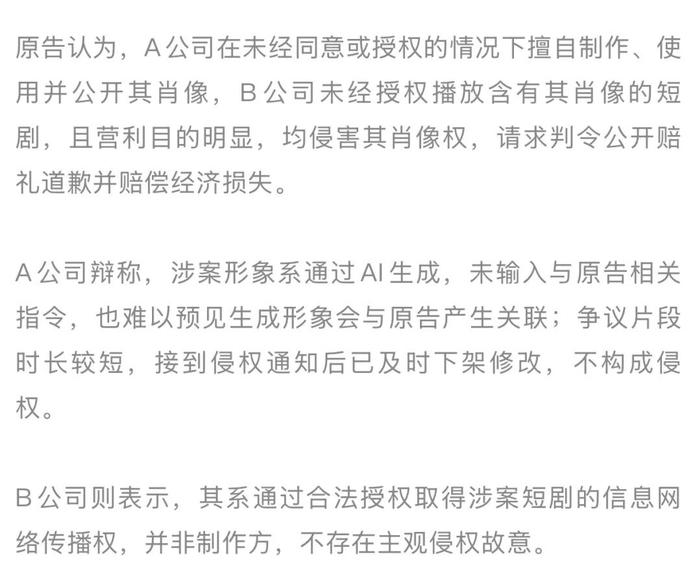此案原告为国内某知名演员,该演员发现被告A公司制作并发布的短剧中,通过AI换脸技术将其肖像拼接至剧中角色面部,相关话题在多个社交平台引发讨论,大量网络用户误认为原告参与了该剧。与此同时,被告B公司在其运营的视频账号上线涉案短剧。