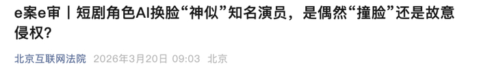 法院查明,涉案短剧共44集、总时长约90分钟,其中两个片段使用AI换脸技术,换脸后的演员面部与原告外貌具有一定相似度。社交平台上出现“短剧疑似AI换脸某演员”等话题,大量网络用户讨论并质疑该剧使用了原告的肖像。A公司虽提交创作过程说明,但未能按法庭要求复现换脸过程,其证据未被采信。