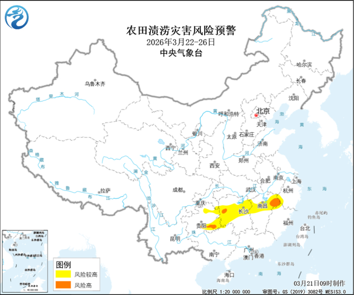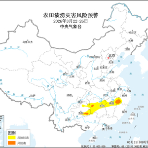 农业农村部和中国气象局2026年3月21日联合发布农田渍涝灾害风险预警:预计3月22日至26日,江汉东部、江淮西南部、江南西部和北部、西南地区东南部及广西北部等地有中到大雨,局地暴雨。贵州东部、湖南中部、江西中部和东北部等地农田渍涝灾害风险较高;贵州黔南中部和黔东南西南部,湖南怀化西部和湘西东南部,江西宜春东部、鹰潭东部及上饶南部等地农田渍涝灾害风险高。建议:降水偏多地区做好库塘蓄水,加强沟渠疏通和排水降渍。