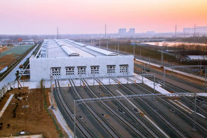 宁波动车组运用所2025年4月正式启用,位于浙江省宁波市鄞州区宁波枢纽邱隘站北侧,总占地面积933.78亩,是长三角首座横跨100米河道的动车运用所,分东西两个场区呈纵列式布置,新建1个检查库、24条存车线、2条自动清洗线、1条不落轮旋线、1条临修线。检查库内设有6条检修线,可同时检修12组标准动车组。