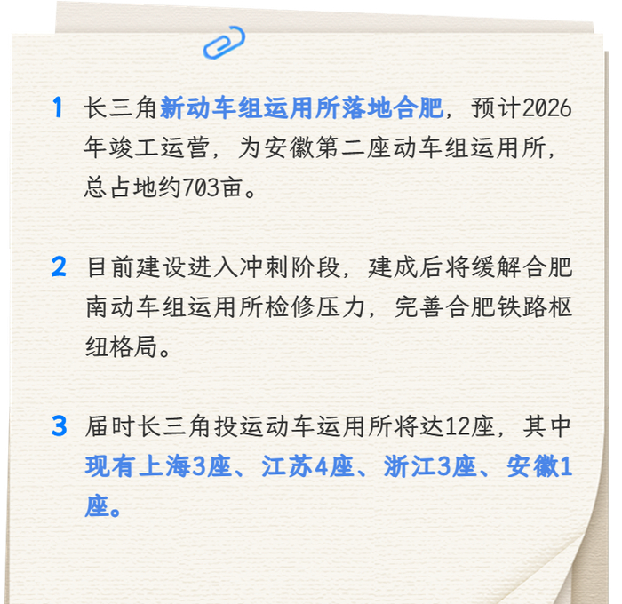 动车组运用所是动车组进行日常运用维修的场所,安徽省目前已有合肥南动车组运用所。合肥动车组运用所坐落于合肥市瑶海区与肥东县交界处,为京港高铁合安段和合新高铁合泗段的配套工程,是安徽省第二座动车组运用所。该动车组运用所于2023年2月开工,总占地约703亩,这座现代化动车组运维基地规模亮眼,规划建设10线检查库、35条存车线,还配套建设受电弓及踏面检测线2条、人工洗车线4条、不落轮旋线2条和临修线1条,能全方位满足动车组存放、检测、整备、维护等作业需求。合肥动车组运用所计划于2026年竣工运营,未来将成为合肥高铁枢纽的重要“后勤保障基地”,为区域铁路网高效运转注入新动能。