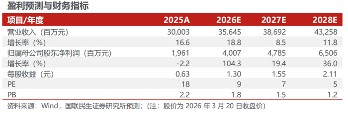 ◾投资建议:公司利润进入释放阶段,现有资产部分铜产能及国内矿山部分仍有增量,叠加铜价处于高位,公司利润有望进一步增长。目前金矿已经收购完成,公司成长性将更为突出。我们预计2026-2028年公司分别实现归母净利润40.07、47.85、65.06亿元,EPS分别为1.30、1.55、2.11元,对应3月20日收盘价PE分别为9X、7X、5X,维持 “推荐”评级。