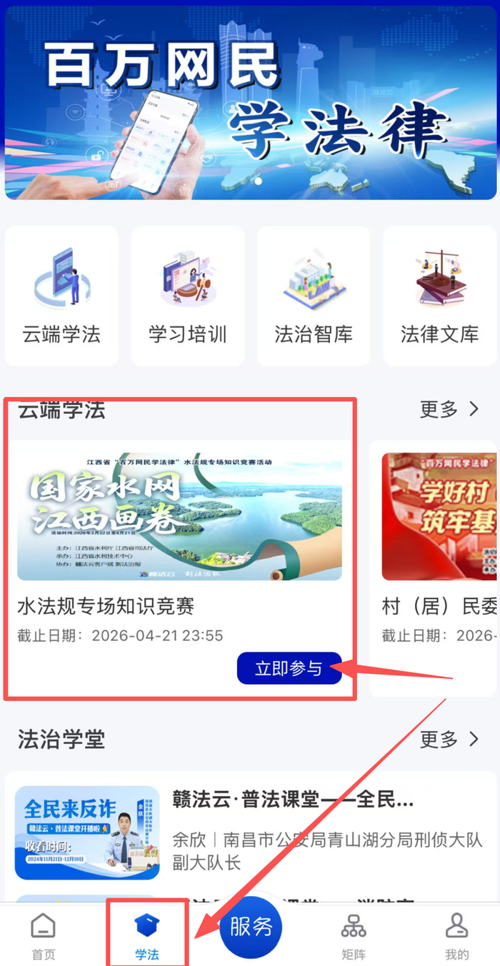 进入“赣法云”客户端首页,点击“学法”栏目,点击“水法规专场”活动页面,实名注册参与在线答题。