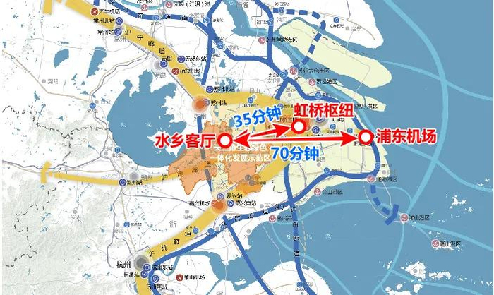 根据长三角一体化示范区综合交通专项规划,区域交通通达效率明确了定量目标:示范区城镇内部搭建15分钟社区出行圈,相邻城镇组团之间30分钟可达,水乡客厅至虹桥枢纽之间35分钟可达,水乡客厅至浦东机场之间70分钟可达。