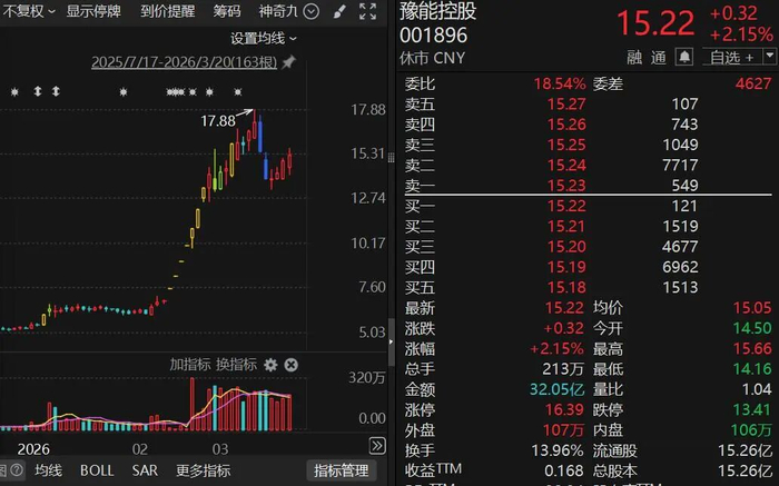 豫能控股是河南省唯一一家集火力发电、新能源、储能(抽水蓄能)、煤炭贸易物流及综合能源服务于一体的省属综合能源上市公司。2月11日早间,公司披露筹划参股投资暨关联交易事项的提示性公告后,股价开始显著拉升,一度收获7连板,今年以来股价大涨192%,公司多次发布股价异动公告。3月21日豫能控股收于15.22元/股,总市值为232亿元。