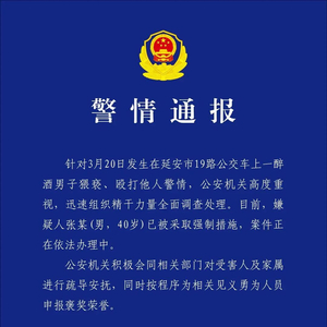 陕西延安市公安局宝塔分局3月21日通报:针对3月20日发生在延安市19路公交车上一醉酒男子猥亵、殴打他人警情,公安机关高度重视,迅速组织精干力量全面调查处理。