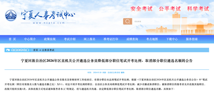 宁夏2026年区直机关公开遴选公务员降低部分职位笔试开考比例、取消部分职位遴选名额