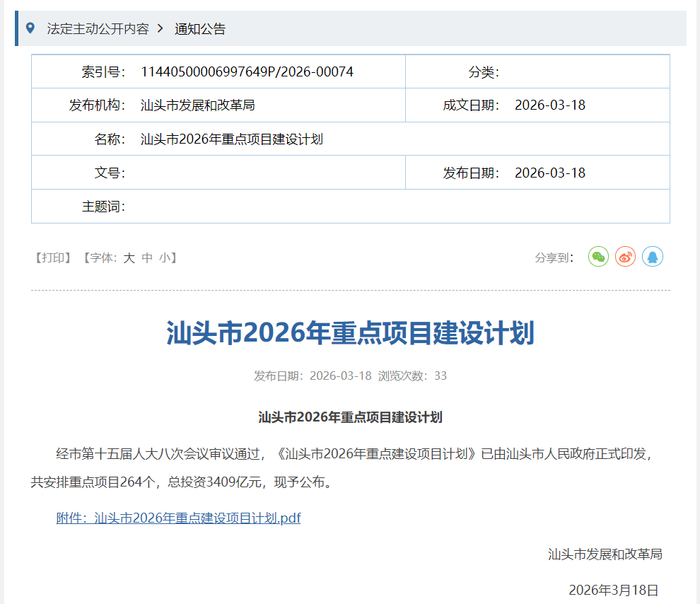 公告显示,经市第十五届人大八次会议审议通过,《汕头市2026年重点建设项目计划》已由汕头市人民政府正式印发,共安排重点项目264个,总投资3409亿元。